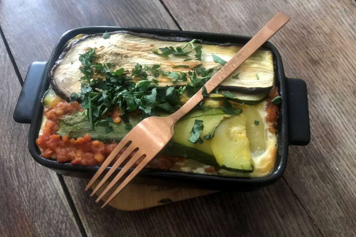 Bakłażany kroimy w półcentymetrowe plastry, oprószamy je solą i odstawiamy, żeby puściły sok. Po 30 minutach odsączamy sok ręcznikiem papierowym i smarujemy je oliwą. Grillujemy i lekko studzimy. Soczewicę gotujemy wg przepisu na opakowaniu i lekko studzimy. Ziemniaki kroimy w plastry i gotujemy do momentu al dente (ok. 15 minut). Na oliwie podsmażamy posiekane cebulę i czosnek. Smażymy kilka minut i dodajemy pomidory w puszce. Po chwili wrzucamy soczewicę i przyprawy. Dusimy ok. 10 minut. Jogurt miksujemy z jajkami, mieszamy z gałką muszkatołową, solą i pieprzem. Piekarnik nagrzewamy do temperatury 190 stopni C. Na dno naczynia wykładamy połowę plastrów bakłażana. Na nie wykładamy połowę masy soczewicowej, a na nią połowę ziemniaków. Na ziemniaki dodajemy resztę soczewicy, znowu ziemniaki i na górę pozostałą część plastrów bakłażana. Wszystko zalewamy dokładnie sosem jogurtowym. Zapiekamy 20-30 minut, aż wbity patyk będzie suchy.