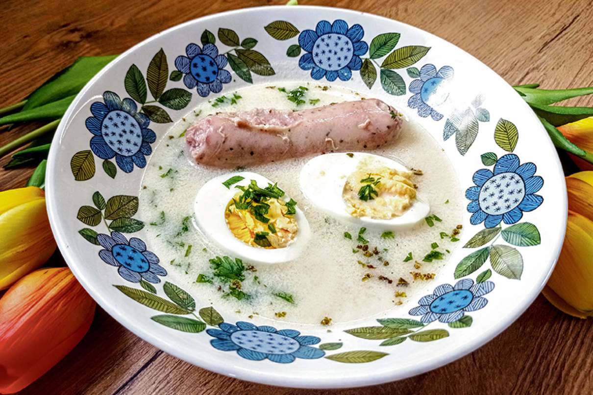 Jajka ugotować na twardo. Do garnka wlać 3,5 I wody, dodać liść laurowy, ziele angielskie i pieprz ziarnisty oraz obraną cebulę. Zagotować. Do wody włożyć kiełbasę i gotować 1 godzinę na małym ogniu. Wyjąć kiełbasę, a do wrzącego wywaru dodać obrany i starty na tarce chrzan lub dodać chrzan ze słoiczka. Gotować 5-10 minut. Mąkę rozmieszać ze śmietaną, wlać do zupy i zagotować. Zdjąć z ognia, wlać sok z cytryny i zamieszać. Doprawić solą i pieprzem. Jajka obrać i drobno posiekać. Zupę podawać posypaną jajkiem, kiełbaską i opcjonalnie z paskami podsmażonego boczku.