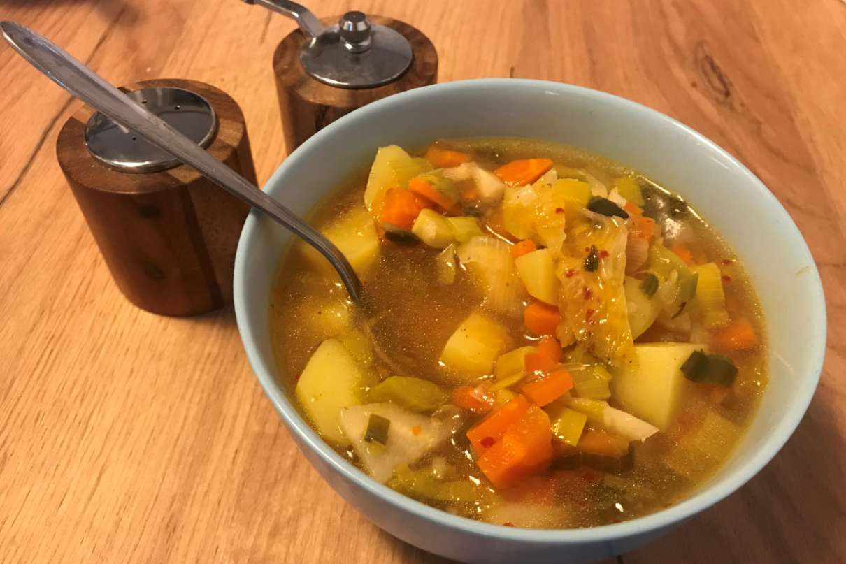 Wszystkie warzywa obieramy, myjemy i kroimy w kostkę lub półplasterki. Pora kroimy w plasterki i podsmażamy w garnku przez kilka minut. Następnie do garnka dorzucamy marchewkę, selera i pietruszkę, i dalej podsmażamy. Po kilku minutach warzywa zalewamy wodą (ok. 2 litrów). Gotujemy ok. 15-20 minut. Po tym czasie dorzucamy do zupy pokrojone w kostkę ziemniaki i gotujemy kolejne 20 minut. Na końcu dodajemy cały słoik kimchi i doprawiamy do smaku.