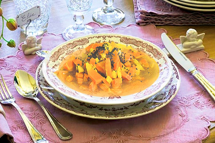 Wszystkie warzywa myjemy i obieramy. Cebulę kroimy w kostkę, marchewkę i pietruszkę w półplasterki. W garnku roztapiamy masło klarowane, wrzucamy cebulę i podsmażamy do zarumienienia. Następnie wrzucamy resztę warzyw i podsmażamy kilka minut. Zalewamy ok. litrem wody. Gotujemy przez 30 minut. Na końcu przyprawiamy solą, pieprzem, przyprawą curry. Wierzch posypujemy ulubionym sezamem.