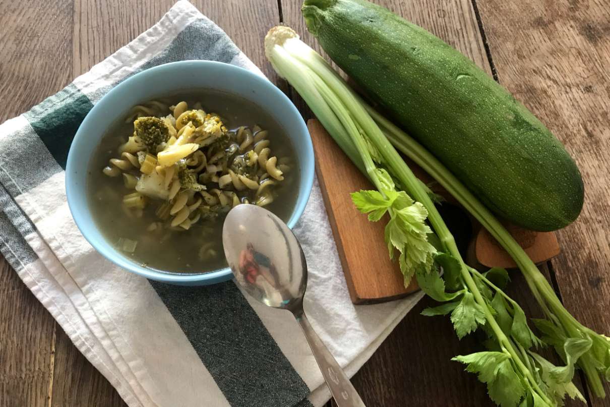 Pora myjemy i kroimy w piórka. Podsmażamy w garnku przez kilka minut. Do pora dodajemy pokrojonego drobno selera i brokuła podzielonego na różyczki. Dalej podsmażamy przez kilka minut. Zalewamy ok. 1,5-2 litrami wody. Gotujemy ok. 20 minut. Po tym czasie dodajemy pokrojoną cukinię, przyprawy oraz makaron z groszku. Gotujemy kolejne 10 minut.