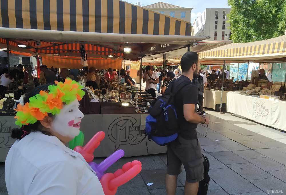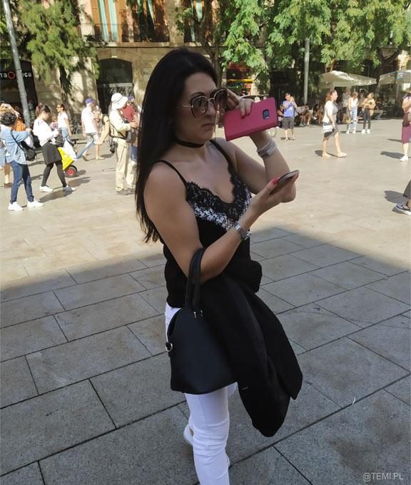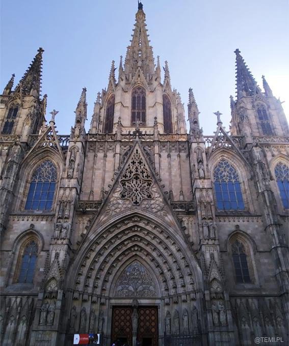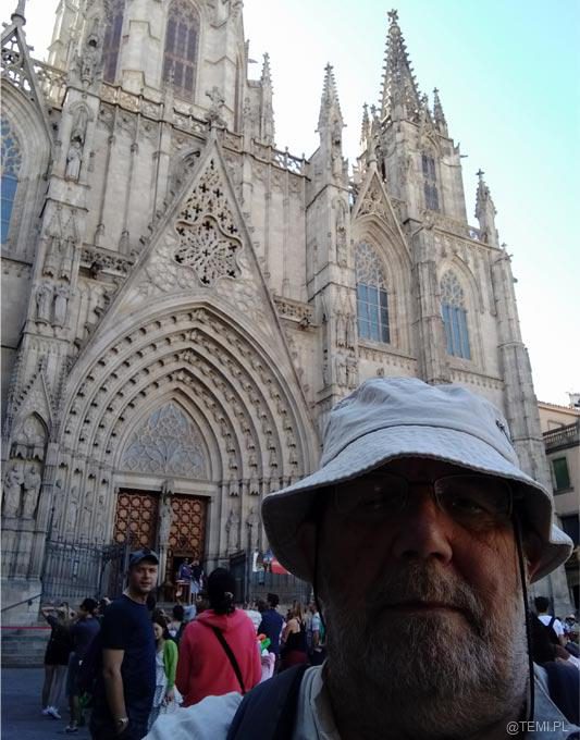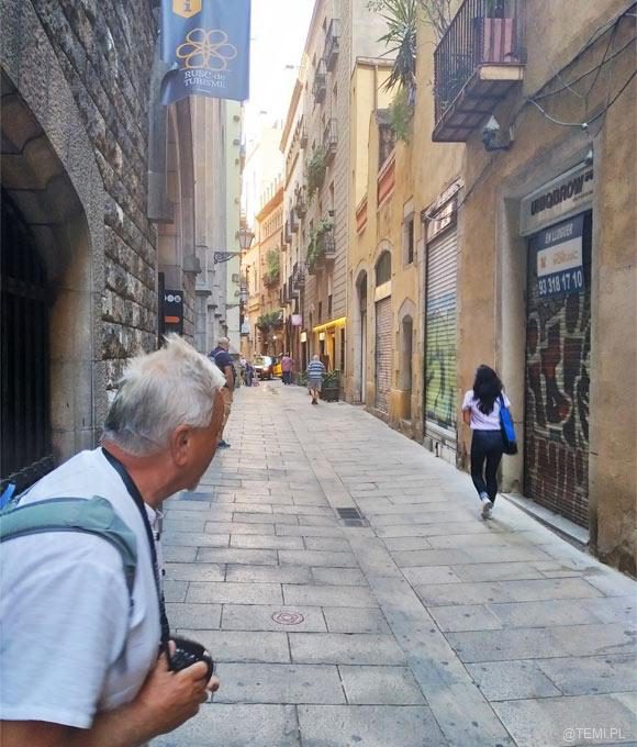 Bob – zwiadowca – wyprowadza nas na plac z gotycką katedrą i gęstym tłumem turystów formujących dwie potężne kolejki do kasy i wejścia. Na rozstawionych straganach prawdziwy targ staroci i krążące z wymalowanymi na biało twarzami korpulentne kobiety. Coś wykrzykują czy oferują – nic z tego nie rozumiem. Po jednej stronie katedry siedzący na schodach Hiszpan ciągnie na gitarze elektryczne smętne solówki w hiszpańskim stylu, a po drugiej stronie duet piano-bandżo wyśpiewuje piosenki ragtaimowe. Tak mają ustawione głośniki, że nie kolidują ze sobą. Po krótkiej naradzie, widząc tempo przesuwających się kolejek, rezygnujemy ze zwiedzania katedry. Ukradkiem robię jeszcze zdjęcie urodziwej turystce i kierujemy się na sąsiedni plac St. Jaume. Przechodzimy wąską uliczką pod przewiązką, spinającą dwa budynki, wzbudzającą zainteresowanie i prawie zmuszającą do obfotografowania, co robi każdy turysta. Znowu kluczymy wąskimi uliczkami, aż do pl. de la Merce, witającego nas powiewem morza i skrzekiem.