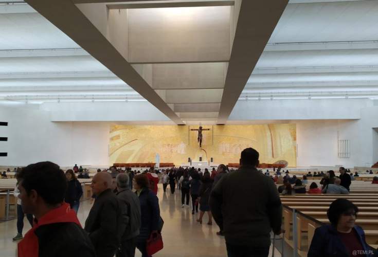 Wracam do sanktuarium zwiedzić pominiętą Bazylikę Pawła VI, zwaną Bazyliką Trójcy Przenajświętszej. Pierwsze co uderza we wnętrzu świątyni, to brak punktów podparcia typu filar, kolumna prawie 100-metrowego płaskiego sufitu. Pachnie jeszcze świeżością, bo ukończono ją w 2007 roku. Od wejścia przez całą bardzo doświetloną salę prowadzi szeroki pas przejścia z rzędami ław kościelnych po obu stronach. W głębi na podeście ołtarz, a za nim prostokątny plafon w kolorze złota. Całość bardziej przypomina salę koncertową lub kinową. Udręczony narastającym bólem stopy, powolnym krokiem udaję się na parking. Tuż przed południem wszyscy jesteśmy przy kamperze. Grzegorz pomaga mi przy zmianie opatrunku, hasło „wsiadamy” i opuszczamy Fatimę.