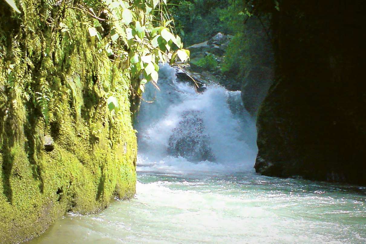 Stopniowo rzecz się wyjaśniła. Żeby się wykąpać, trzeba było najpierw wspiąć się chyba z półtora kilometra błotnistą, wąską ścieżką, przekraczając kilka strumieni i mijając sporo pieniących się kaskad różnego rozmiaru. Miejscami zarówno we wspinaczce, jak i w przeprawie pomagały liny – jedna, z ciężkim węzłem, służyła do skoku w stylu Tarzana przez wartki skłębiony strumień. Właściwe kąpielisko – gdy już do niego dotarliśmy – okazało się zespołem niewielkich skalnych basenów – kamiennych, z dnem wysypanym piaskiem albo wyłożonym niebieskimi kafelkami. Poszczególne baseny – niewielkie i zwykle z wodą sięgającą pasa – znajdowały się na różnych poziomach meandrującego po zboczu strumienia. Pomiędzy nimi zbudowano nieduże wiaty z daszkami z palmowych liści, które mogły służyć jako przebieralnie lub miejsca piknikowe. Częściej to drugie, bo Ekwadorczycy zwykle nie potrzebują przebieralni – wchodzą do wody w koszulkach i szortach czy sukienkach, a potem spokojnie i z lubością wysychają.