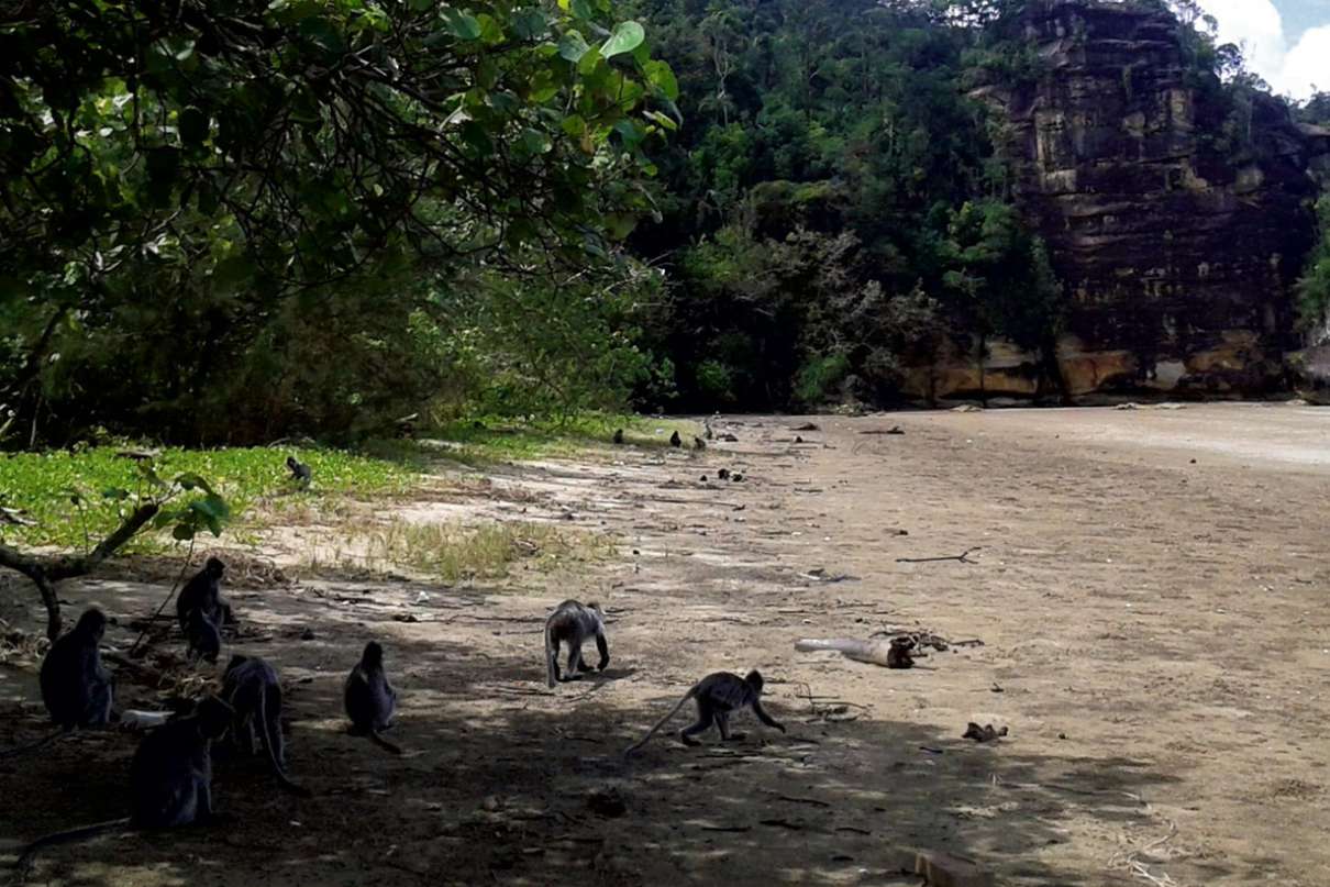 Wypady na plażę w Bako robią także lutungi albo langury srebrzyste – małpy mniejsze i nie tak sławne jak nosacze, ale i piękne, i rzadkie. O ile nosacze przypominają eleganckich starszych panów, langury srebrzyste to łagodne, kosmate gnomy. Mają lekko zatroskane, czarne twarze chińskich bożków, duże i piękne brązowe oczy, a głowy czesane w „czub”. Są to małpy lasów mangrowych i ich środowisko gwałtownie się kurczy. W Bako nietrudno je spotkać, bo i tu, gdzie namorzyny sąsiadują z morzem, poruszają się po stosunkowo niewielkim obszarze.
