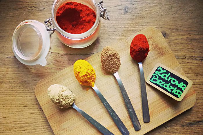 PRZYPRAWY to kolejny punkt zmian. Wszelkie mieszanki ze wzmacniaczami smaku, tzw. żółte proszki, wędrują do kosza! Trzeba też uważać na gotowe mieszanki ziołowe, ponieważ w ich składzie może się również znaleźć cukier lub inne cuda. Najlepiej wybrać zioła pakowane pojedynczo i samodzielnie łączyć aromaty podczas gotowania. Przyprawy mogą mieć niesamowitą moc przeciwzapalną, którą warto wykorzystać w swojej kuchni. Najlepsze przyprawy o tym działaniu to kurkuma, cynamon cejloński, imbir suszony i pieprz. Natomiast wszelkie przyprawy ziołowe to oprócz walorów smakowych dodatkowa dawka makro i mikroelementów w naszym posiłku, dlatego nie żałujmy ich sobie.