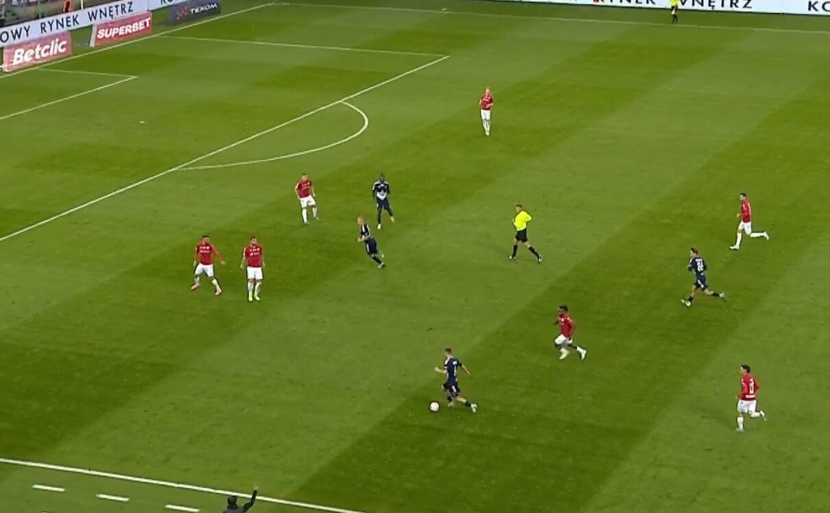 Krakowianie przypieczętowali swoje zwycięstwo golem zdobytym w doliczonym czasie gry. Z piłką w polu karnym znalazł się niepilnowany Baena. Znalazł się on w sytuacji sam na sam. Schodził on do prawej strony. Nie mógł on więc oddawać strzału, lecz dogrywał on wzdłuż pola bramkowego. Piłkę do siatki skierował natomiast główkujący z najbliższej odległości – Zwoliński.