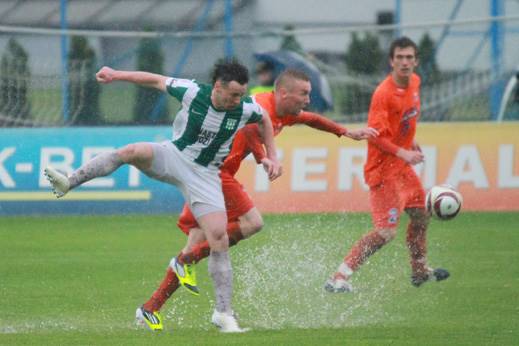 W sobotę ważnym aktorem spotkania była pogoda. Padający od rana deszcz sprawił, że warunki na boisku były ekstremalne, a piłka często zatrzymywała się w kałużach. Nie zabrakło jednak walki z obydwu stron. W pierwszej połowie „Słoniki” miały swoje okazje, ale dobrze w bramce gości spisywał się Michał Wróbel. Żadnych rezultatów nie przyniosły także sporadyczne ataki grudziądzan.