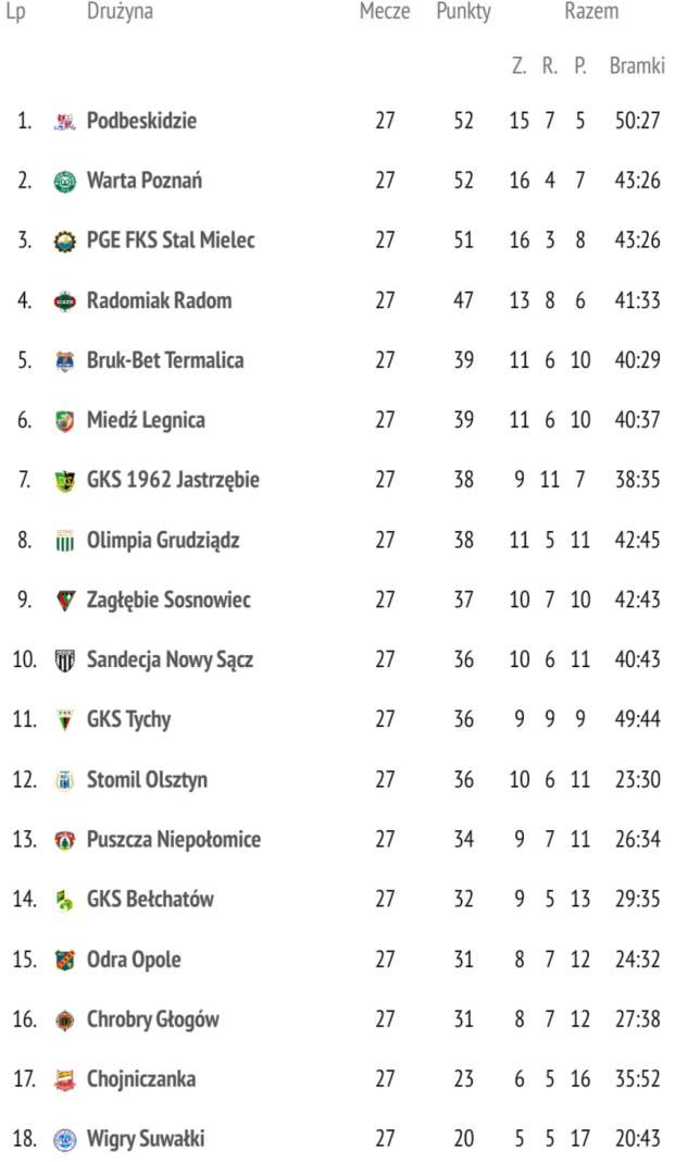 Ciekawie jest również na dole tabeli, gdzie wciąż wiele drużyn nie ma zapewnionego utrzymania. Nie do pozazdroszczenia jest sytuacja Wigier Suwałki, które przegrały czwarty mecz z rzędu i tracą już 11 punktów do bezpiecznego miejsca.