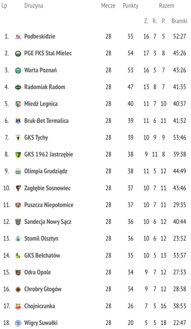 Dużo dzieje się na samym szczycie tabeli, gdzie raz za razem któryś z faworytów traci punkty. Tym razem padło na Wartę Poznań, która zremisowała z Miedzią Legnica 0:0. Potknięcie „Warciarzy” wykorzystały Podbeskidzie Bielsko-Biała (2:0 ze Stomilem Olsztyn) i Stal Mielec (2:0 z Radomiakiem), które zajmują teraz dwa pierwsze miejsca w tabeli Fortuna 1. Ligi – miejsca, które po ostatniej rozegranej kolejce dają bezpośredni awans do najwyższej klasy rozgrywkowej w Polsce.
