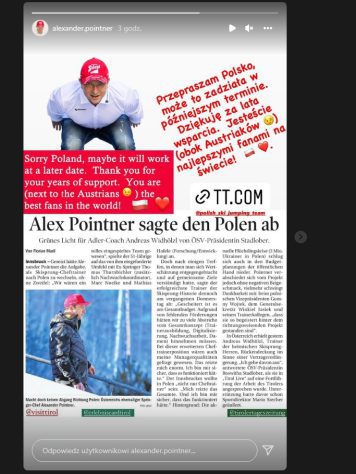 Pointner jako członków sztabu widział: Thomasa Thurnbichlera, Marca Noelke oraz Mathiasa Hafele. Austriak nie zapomina o polskich kibicach. – Przepraszam Polsko. Może to zadziała innym razem. Jesteście najwspanialszymi kibicami (obok Austriaków) – napisał w mediach społecznościowych.