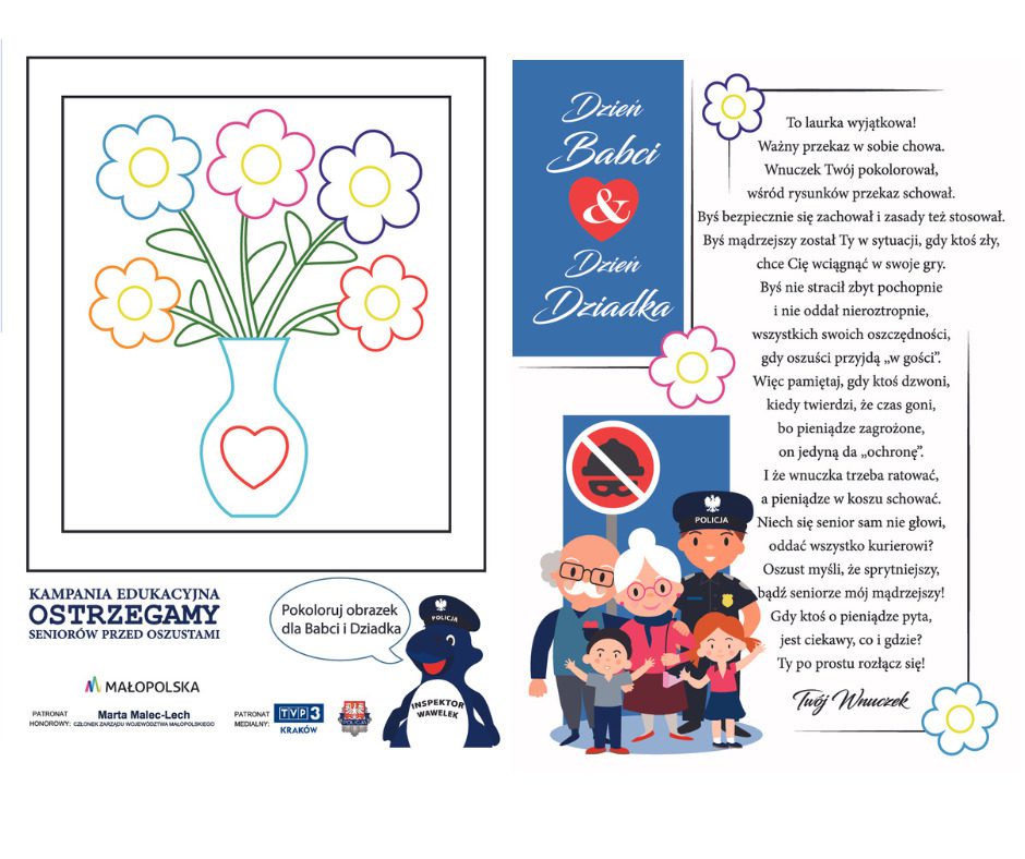 W małopolskich przedszkolach zainaugurowano kampanię edukacyjną „Ostrzegamy seniorów przed oszustami”. To działania realizowane dzięki porozumieniu pomiędzy Urzędem Marszałkowskim Województwa Małopolskiego a Komendą Wojewódzką Policji w Krakowie w ramach zadania „Wielopokoleniowa Edukacja Małopolan”. Założeniem takiej wielopokoleniowej edukacji jest dotarcie poprzez dzieci do ich bliskich – rodziców, babć, dziadków, i przekazanie im informacji o sposobach działania oszustów. Mimo licznych działań profilaktycznych oraz kampanii informacyjnych nadal dochodzi do zdarzeń, gdzie przestępcy, działając metodą „na wnuczka” lub „na policjanta”, dokonują oszustw na szkodę seniorów.