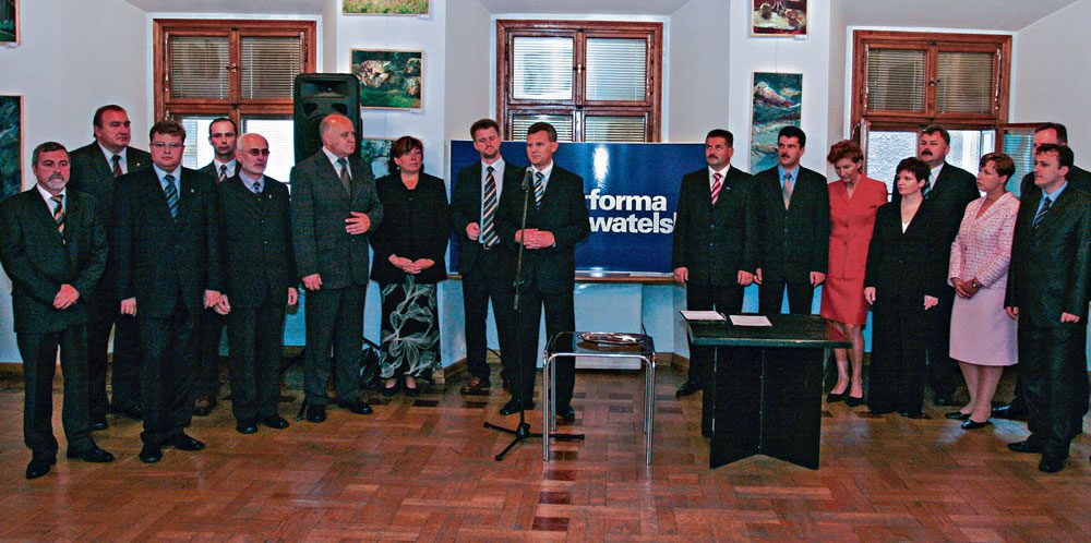 W naszym regionie Platforma Obywatelska zaczęła się… od konfliktu. W przeciwnych narożnikach stali wówczas senator rządzącej Akcji Wyborczej Solidarność Andrzej Sikora, związkowiec, naówczas jedna z najbardziej wpływowych osób w Tarnowie oraz Aleksander Grad, który mimo stosunkowo młodego wieku – liczył sobie w wówczas 39 lat – mógł się pochwalić całkiem przyzwoitym dorobkiem w polityce. W swoim cv miał posadę zastępcy wójta Pleśnej, ostatniego wojewody tarnowskiego, wiceministra zdrowia i doradcy Banku Światowego. Politycznie Grad działał w Ruchu Stu, skąd przeszedł do Stronnictwa Konserwatywno-Ludowego. Obu panom szło wówczas o przejęcie „rządu dusz” na lokalnej prawicy.
