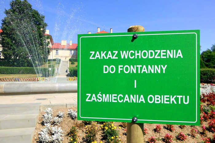 W pobliżu fontanny w Parku Sanguszków w Tarnowie zamontowane zostały tabliczki przypominające zarówno o zakazie wchodzenia do obiektu, jak i zaśmiecania otoczenia.