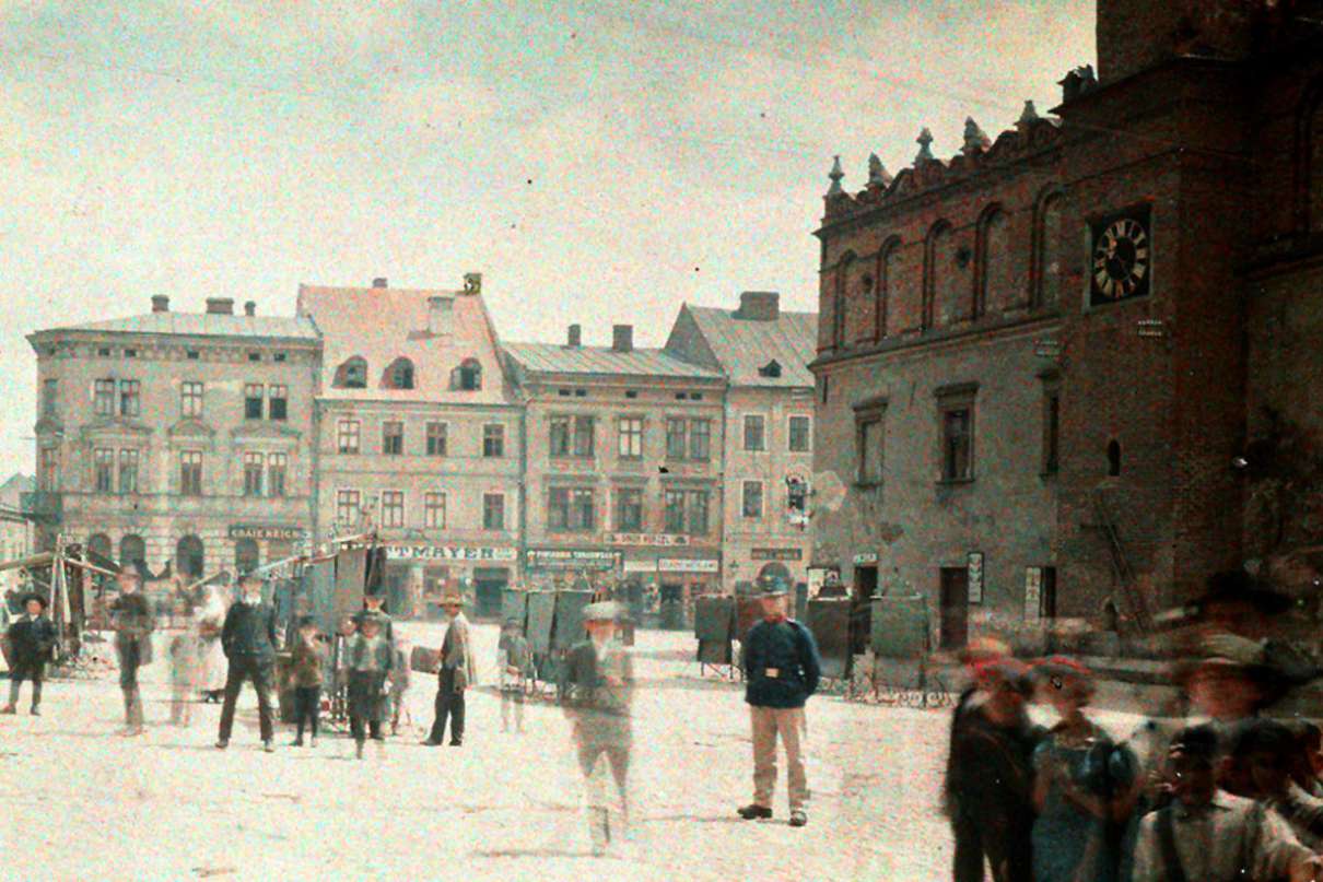 Na autochromie o wymiarach 8,9 x 11,9 cm widać tarnowski ratusz od strony Wielkich Schodów, w którym znajdował się główny skład nasion oraz prowadzono sprzedaż mięsa. Na budynku znajdowały się charakterystyczne w tym okresie elektryczne latarnie. Na fotografii dostrzec można także otaczające rynek kamieniczki, mieszkańców pozujących do zdjęcia oraz dziewczynkę opierającą się o hydrant.