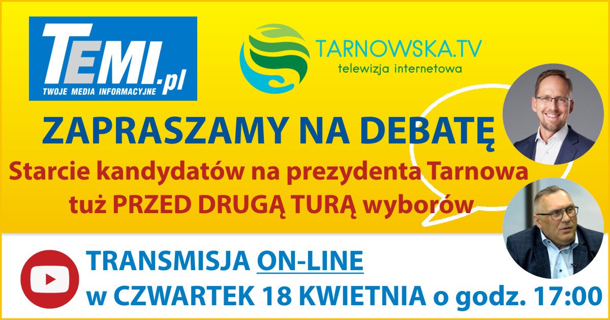 Starcie kandydatów na prezydenta Tarnowa tuż przed drugą turą wyborów już 18 kwietnia (czwartek) o godz. 17.00. Debata będzie transmitowana w przekazie bezpośrednim na stronach internetowych TEMI i Tarnowskiej.tv, a po debacie organizatorzy udostępnią jej zapis.