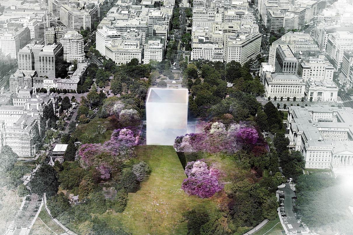 – Nowa siedziba prezydenta USA w Waszyngtonie, którą zaprojektowałem, stanowi prostą geometrycznie bryłę „unoszącą się” nad obecnymi ogrodami Białego Domu. Ikoniczny charakter obiektu został zachowany w kolorze, nazwie i tradycji architektury amerykańskiej. Budynek zlokalizowany został w tym samym miejscu, co obecny. Mimo że obiekt jest znacznie większy (75x100x120), nie demoluje istniejących ogrodów, które otaczają nową rezydencję. Budynek nie posiada podziałów pionowych i poziomych, jest jednobarwny i jednorodny w swojej strukturze wydrukowany w technologii 3D – mówi architekt Wiesław Michałek.