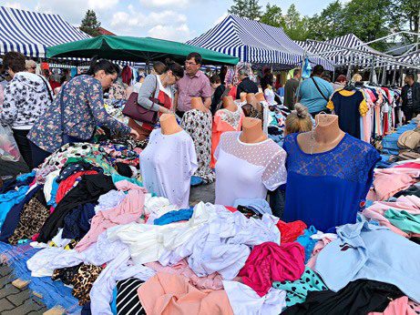 Im dalej, tym asortyment bardziej urozmaicony – pod zadaszonymi straganami rozłożono sprzęt gospodarstwa domowego, garnki, talerze, komplety sztućców, koce, pledy i pościel.