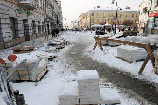 Ślamazarnie ciągnący się remont znów… został przerwany. I to nie z tego powodu, że autor projektu rewitalizacji, Grzegorz Ślusarczyk, wstrzymał roboty, bo nie zgadza się na zastąpienie granitu polskiej produkcji chińskim zamiennikiem. Jak poinformował nas nadzorujący miejskie inwestycje drogowe wiceprezydent Henryk Słomka‑Narożański, prace budowlane nie mogą być prowadzone, gdy temperatura spada poniżej minus dziesięciu stopni Celsjusza. – Nie ma warunków technicznych do kontynuowania inwestycji – stwierdził. – Trzeba czekać na podniesienie się temperatur.