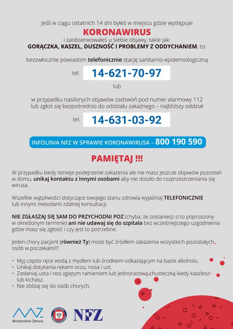w przypadku podejrzenia o zarażenie koronawirusem.
