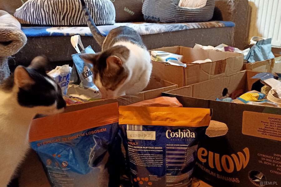 Dzisiaj (12 lipca) do siedziby fundacji przy ul. Lwowskiej trafiło kolejnych kilkadziesiąt kilogramów żywności dla bezdomnych kotów. Wśród darów składanych w CH Świt w Tarnowie znalazło się także kilka worków kociego żwirku.
