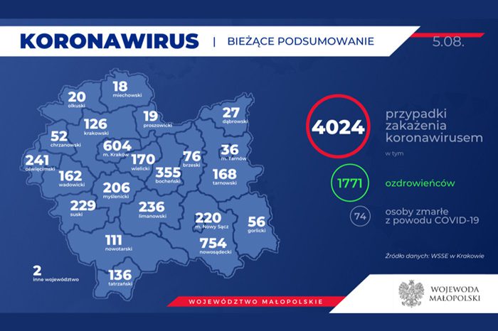 Ostatnie badania laboratoryjne potwierdziły zakażenie koronawirusem u kolejnych 90 osób. To 47 kobiet i 43 mężczyzn, w wieku od 4 miesięcy do 91 lat, z powiatu nowosądeckiego (23 osoby), Krakowa (22 osoby), Nowego Sącza (10 osób), powiatu bocheńskiego i wielickiego (po 5 osób), Tarnowa (4 osoby), powiatów: gorlickiego, krakowskiego, limanowskiego i oświęcimskiego (po 3 osoby), chrzanowskiego, myślenickiego, nowotarskiego, olkuskiego (po 2 osoby) oraz powiatu dąbrowskiego (1 osoba). Aktualnie 8 osób jest hospitalizowanych, pozostałe przebywają w izolacji.