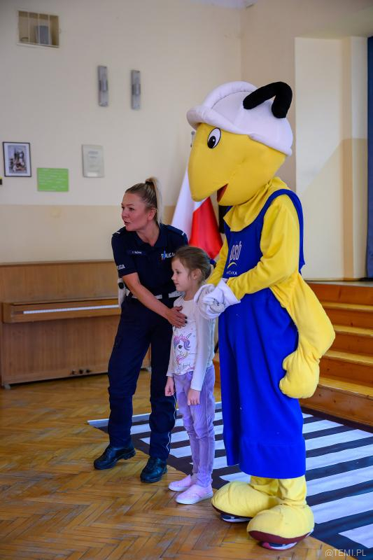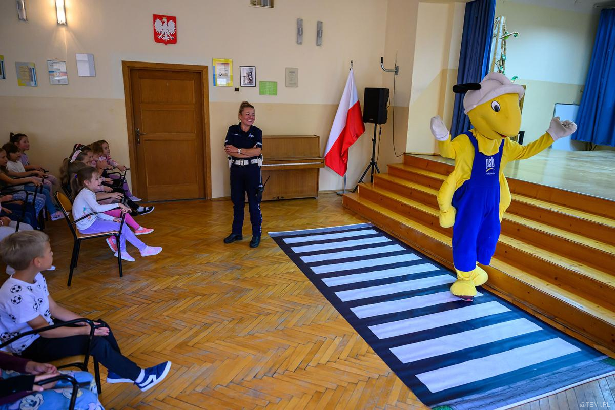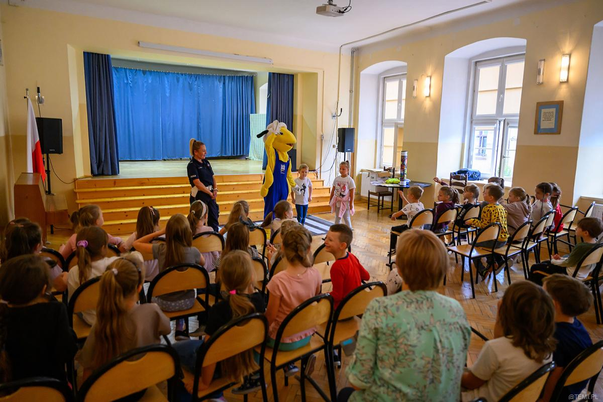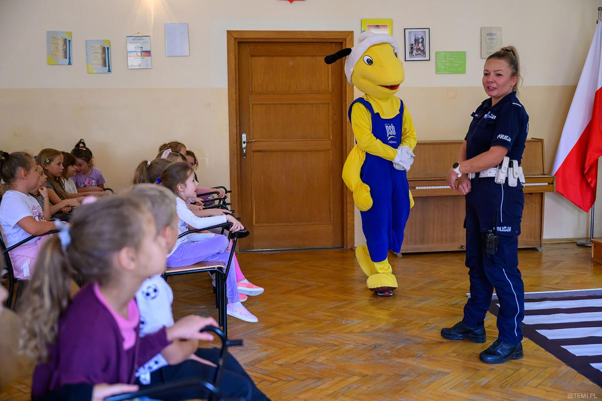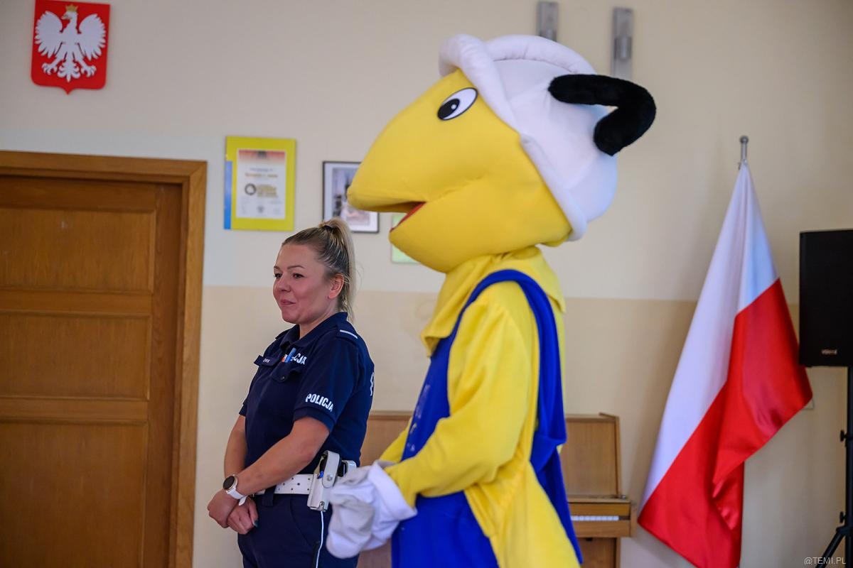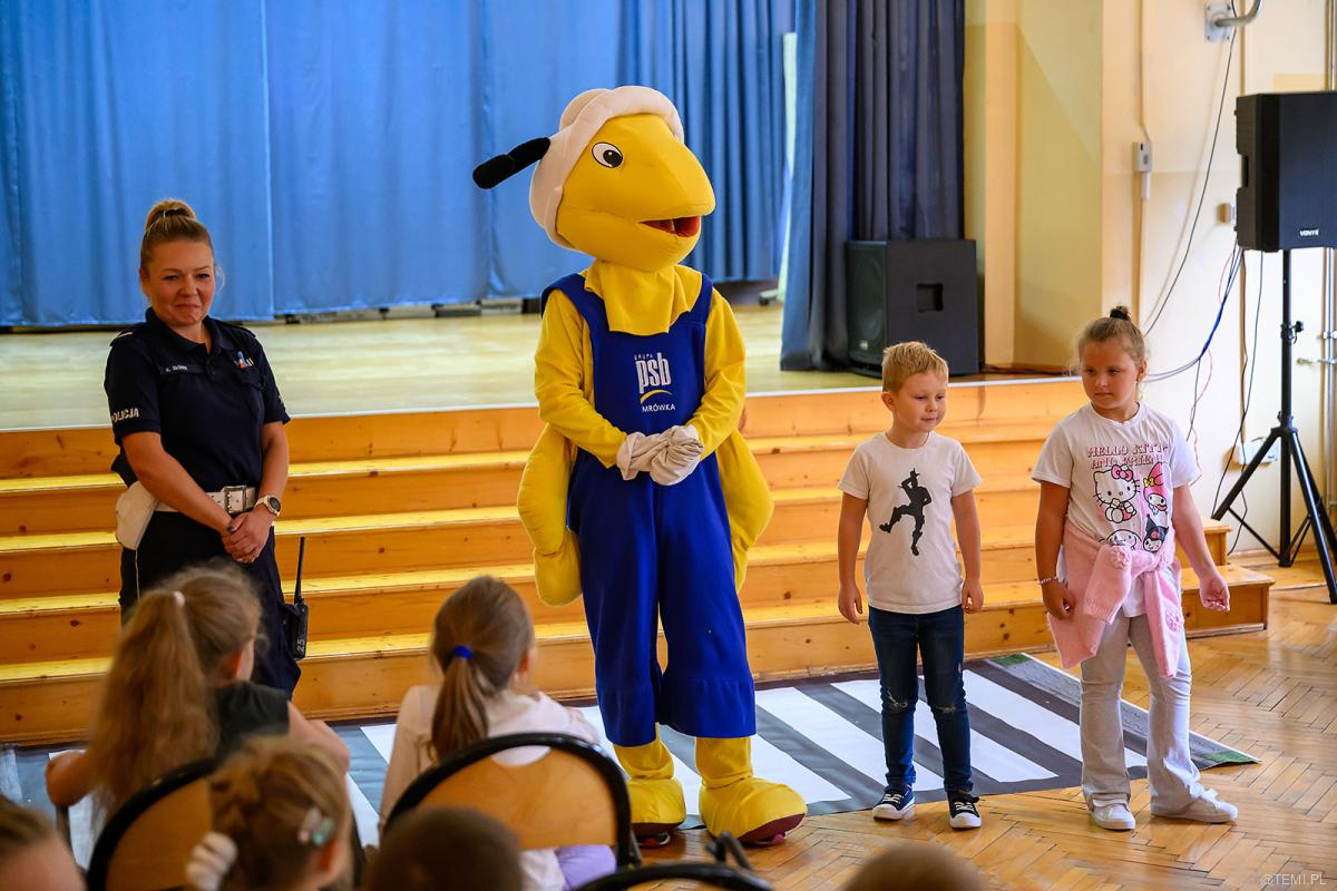 Żółta maskotka w towarzystwie policjantów Komendy Miejskiej Policji w Tarnowie przemierza kolejne szkoły, by edukować dzieci w zakresie bezpiecznego poruszania się po drogach.