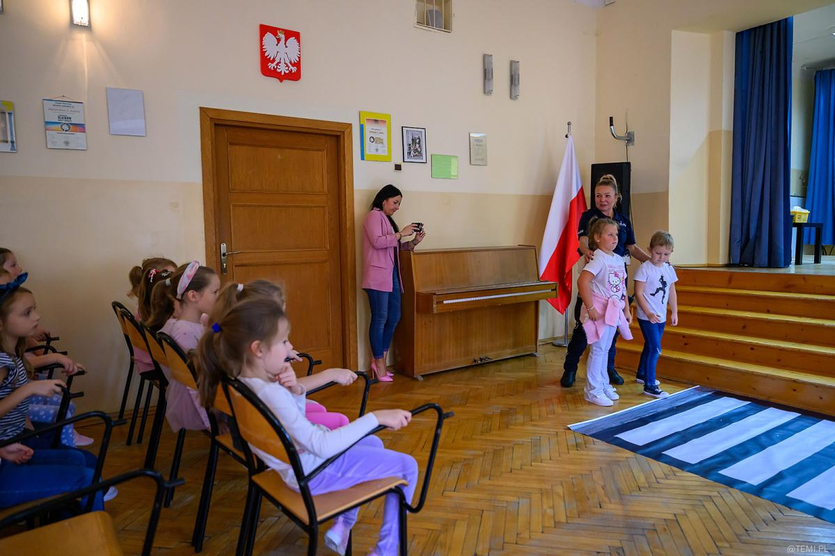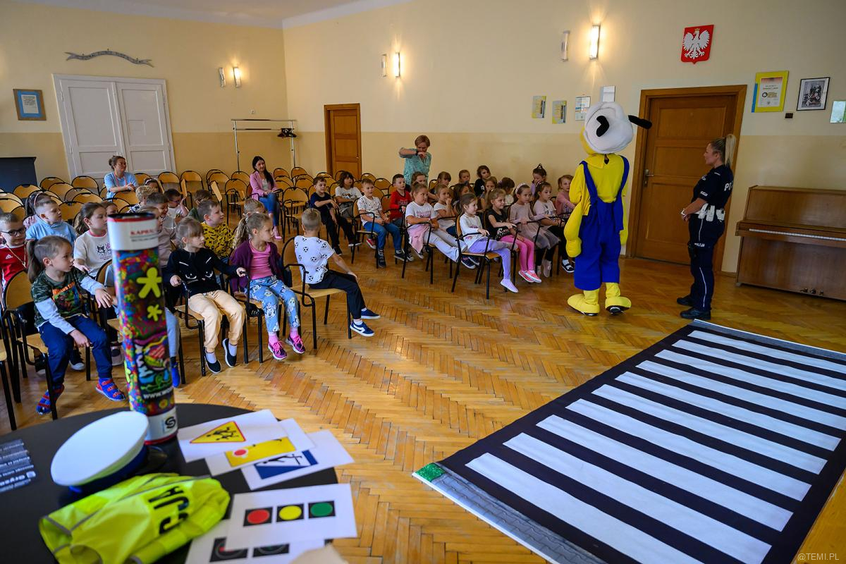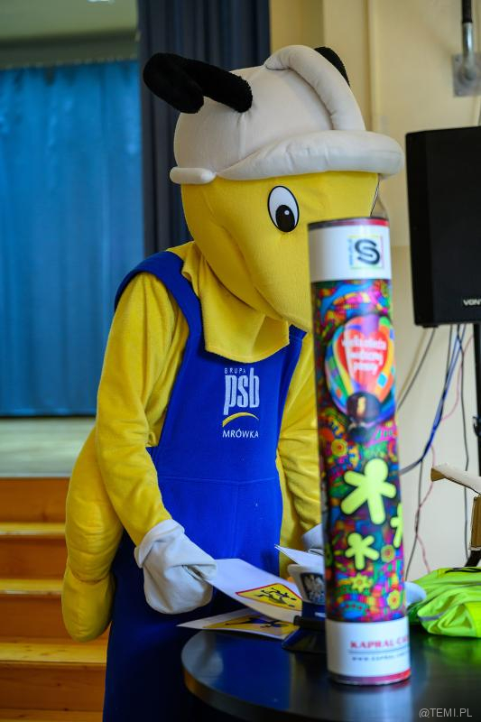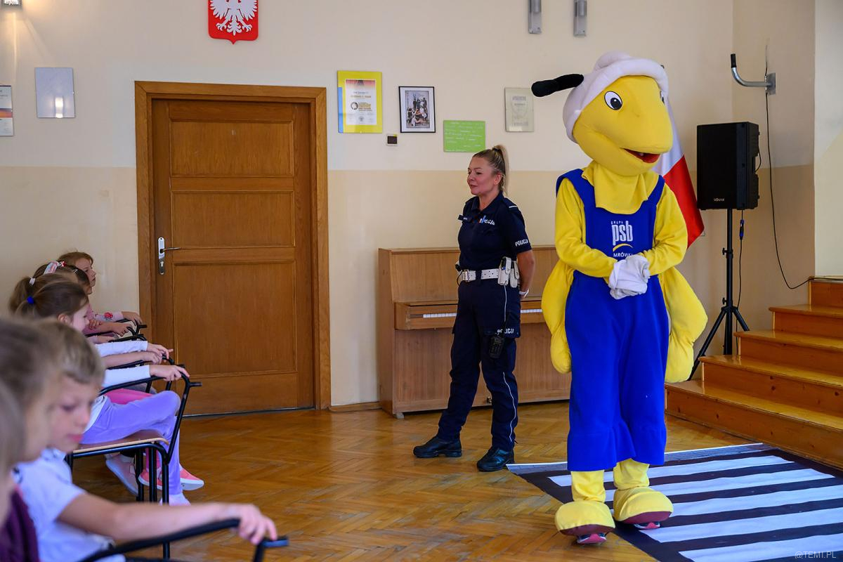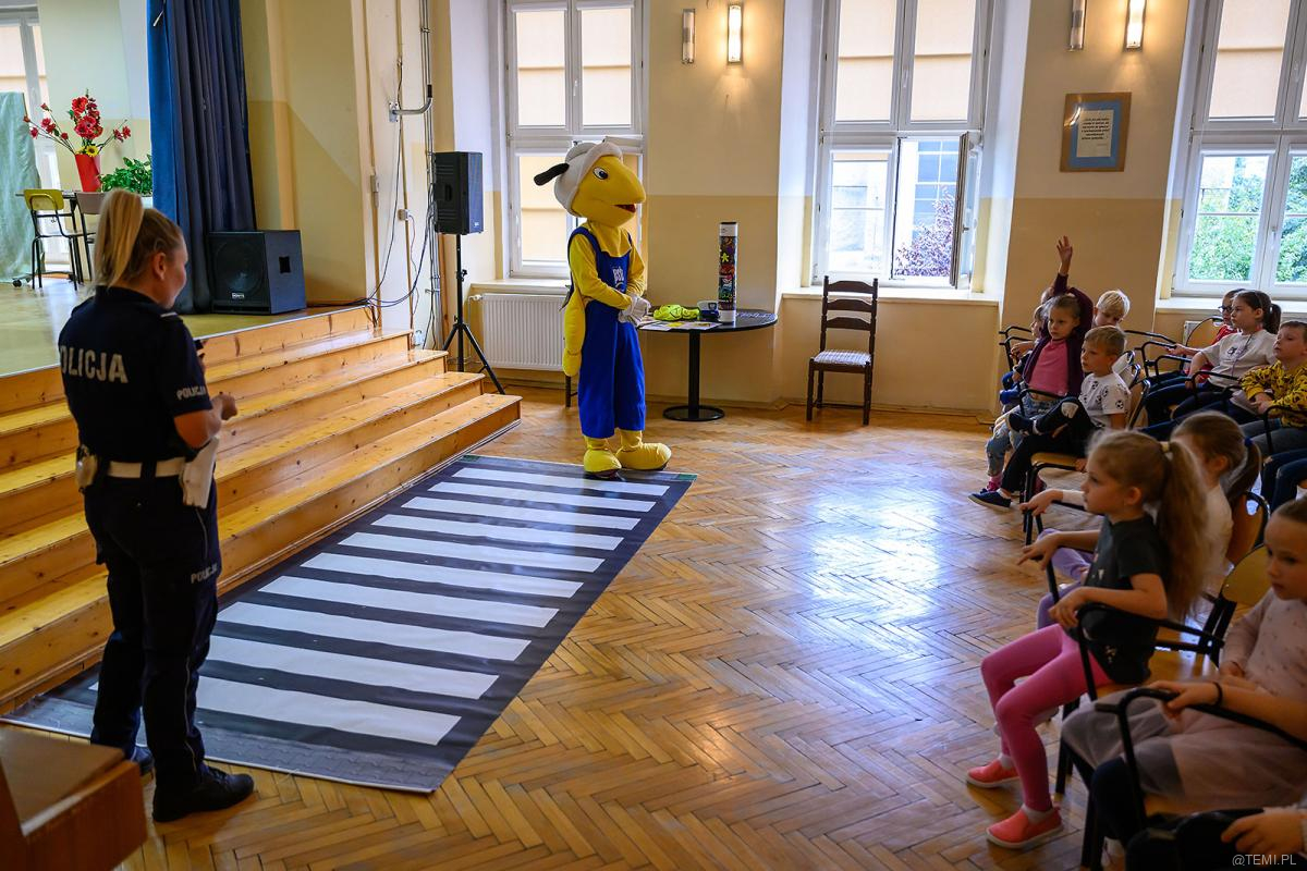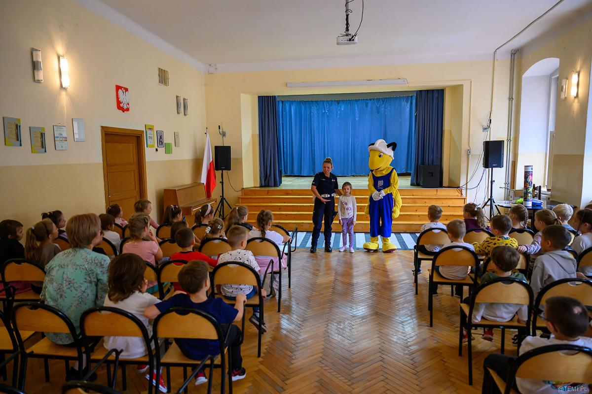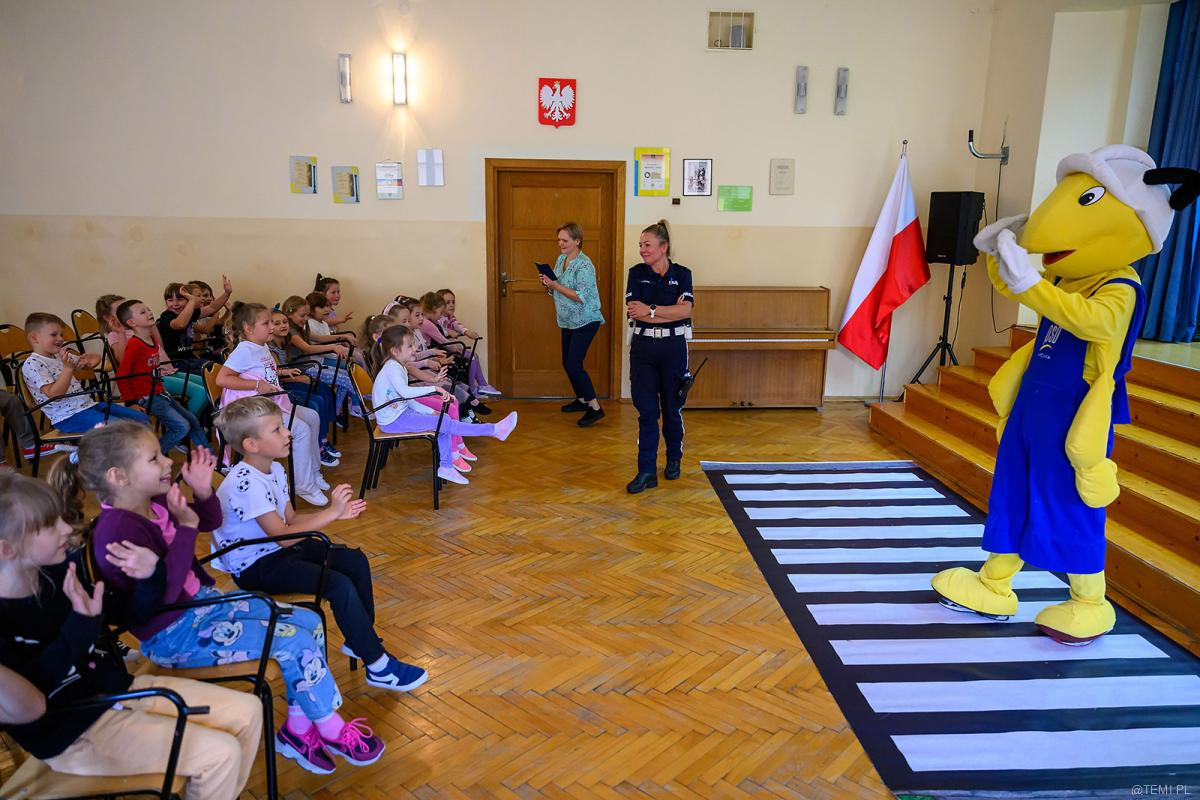 Żółta maskotka w towarzystwie policjantów Komendy Miejskiej Policji w Tarnowie przemierza kolejne szkoły, by edukować dzieci w zakresie bezpiecznego poruszania się po drogach.