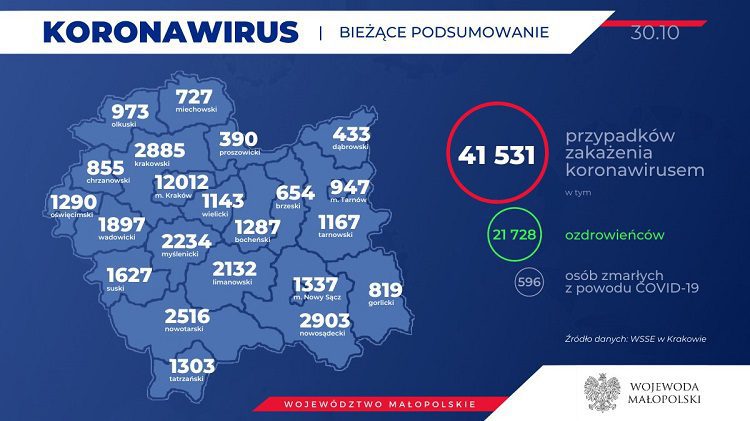 Szczegółowy raport o zakażeniach w Małopolsce przedstawiła Wojewódzka Stacja Sanitarno-Epidemiologiczna w Krakowie. Ostatnie badania laboratoryjne potwierdziły zakażenie koronawirusem u kolejnych 1916 osób – z Krakowa (516), powiatu nowosądeckiego (147), wadowickiego (141), Nowego Sącza (100), powiatu krakowskiego (100), limanowskiego (89), bocheńskiego (70), oświęcimskiego (70), nowotarskiego (68), olkuskiego (65), tarnowskiego (63), chrzanowskiego (56), Tarnowa (54), powiatu dąbrowskiego (54), gorlickiego (53), suskiego (51), miechowskiego (43), proszowickiego (43), myślenickiego (40), tatrzańskiego (34), wielickiego (33) oraz brzeskiego (26). Aktualnie 46 osób jest hospitalizowanych, pozostałe przebywają w izolacji. Obecnie w Małopolsce zakażenie koronawirusem zostało potwierdzone u 41 531 osób. Jednocześnie w Małopolsce przybyło 1050 ozdrowieńców i jest to obecnie 21 728 osób.