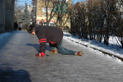 Najgorzej jest wtedy, gdy w początkowej fazie odwilży na nieuprzątnięty zamarznięty śnieg pada deszcz. Wówczas w kilka minut ślizgawka jest gotowa i przechodnie mają kłopoty z przyczepnością. Dla wielu, niestety, źle się to kończy.