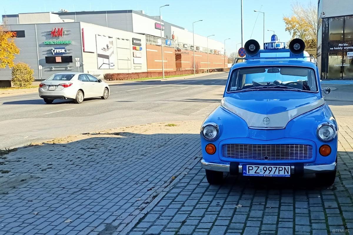 Samochód, zaparkowany na Krakowskiej, jest wersją radiowozu milicyjnego. Na przednich drzwiach ma umieszczony skrót: MO, co oznacza Milicję Obywatelską. Na dachu znajdują się niebieska lampa błyskowa oraz charakterystyczne głośniki. Od końca lat 60. milicyjne warszawy w coraz większym stopniu zastępowane były licencyjnymi polskimi fiatami 125p.