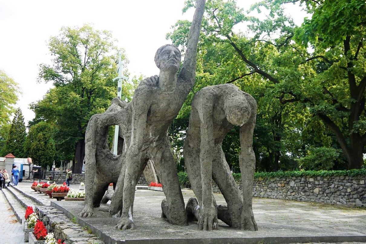 Jak można zauważyć wielokrotnie czekając w tym miejscu na autobus lub korzystając z opisu pomnika na Wikipedii: ,,Pomnik składa się z dwóch części. Pierwsza z nich przedstawia trzy klęczące postacie męczenników, z sercami wydartymi z ich piersi. Druga część ukazuje dwa stojące miecze, nawiązujące do bitwy pod Grunwaldem, oraz płaczące dziecko przy niedostępnej, zimnej i obcej ścianie.”
