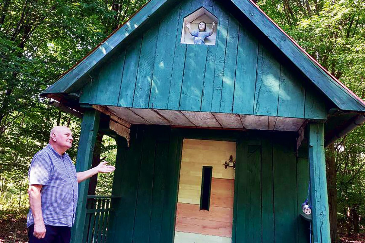 Antoni Kura przy kapliczce św. Piotra w Biadolinach Radłowskich | Fot. autorka