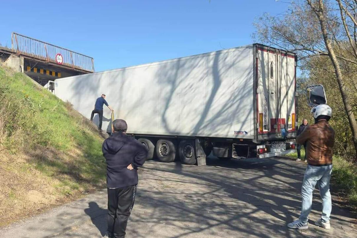 Kierowca wielkiej ukraińskiej ciężarówki zawierzając wskazaniom nawigacji wjechał w ulicę Przemysłową w Tarnowie i kierował się na południe. Rzeczywiście jest możliwość dotarcia do Tarnowca ul. Przemysłową, jednak tylko samochodami osobowym i motocyklami. 40-tonowy zestaw ciężarowy tędy nie przejedzie. Kierowany przez Ukraińca pojazd utknął przed zbyt niskim wiaduktem.