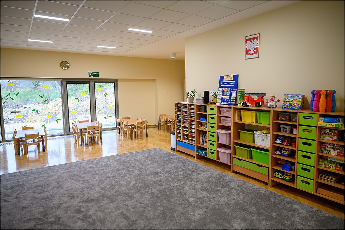W nowym przedszkolu działa sześć oddziałów. Cztery sale zajęciowe oraz sala gimnastyczna usytuowane są na parterze z bezpośrednim wyjściem na taras i ogród. Pozostałe dwie sale zajęciowe zlokalizowane są natomiast na piętrze i również mają bezpośrednie wyjście na taras w postaci tzw. zielonego dachu.