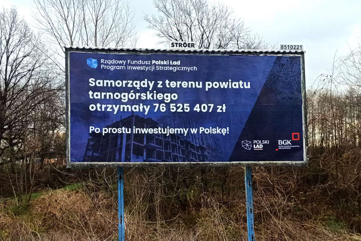 „Samorządy z terenu powiatu tarnogórskiego otrzymały 76 525 407 zł. Po prostu inwestujemy w Polskę” – czytamy na bilbordach zlokalizowanych przy ul. Szujskiego oraz Okrężnej w Tarnowie.
