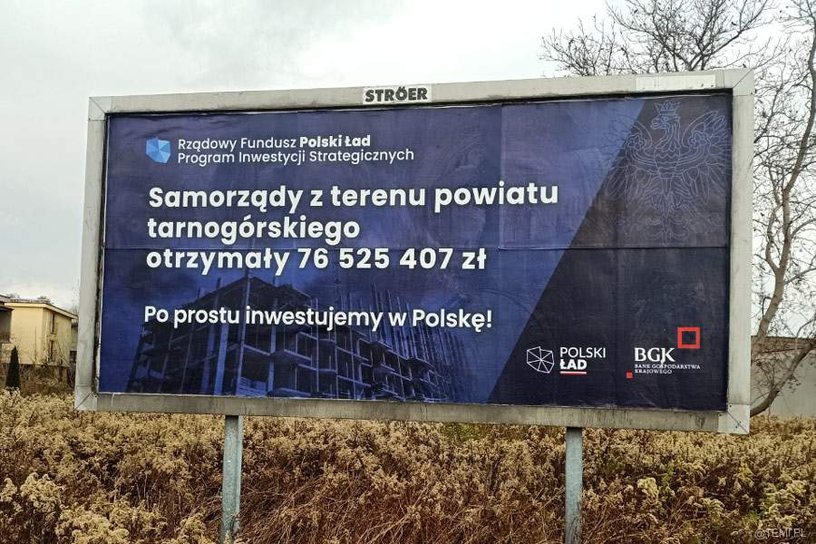 „Samorządy z terenu powiatu tarnogórskiego otrzymały 76 525 407 zł. Po prostu inwestujemy w Polskę” – czytamy na bilbordach zlokalizowanych przy ul. Szujskiego oraz Okrężnej w Tarnowie.