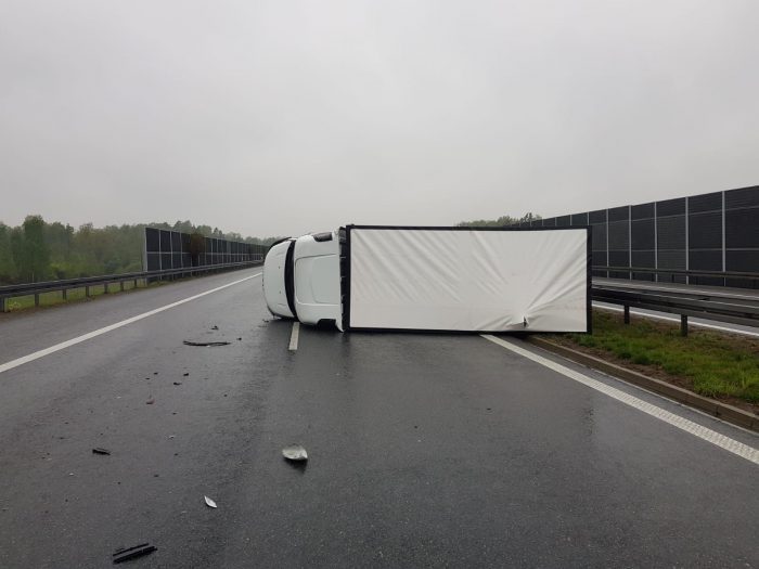 Wczoraj po godzinie dziewiątej rano na mokrej jezdni autostradowej nitki w kierunku Rzeszowa, chwile grozy przeżył kierowca dostawczego Iveco. Gdy dojeżdżał do węzła Brzesko zauważył, że będzie wyprzedzany przez inny samochód. Niestety na śliskiej drodze kierowca osobówki stracił panowanie nad swoim samochodem i doprowadził do kolizji z ciężarówką. Ta wskutek uderzenia przewróciła się na lewy bok, całkowicie blokując lewy pas jezdni. Kierowca osobówki kilkadziesiąt metrów dalej zatrzymał się po prawej stronie na pasie awaryjnym.
