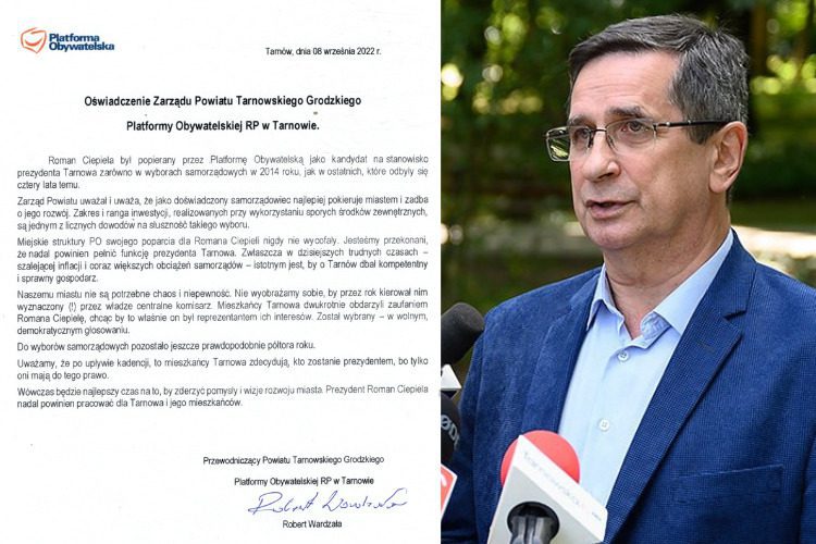 Tymczasem urzędującego prezydenta Tarnowa popiera tarnowska Platforma Obywatelska. Tak, ta partia, w której członkostwo Roman Ciepiela zawiesił jesienią 2019 roku. W oświadczeniu podpisanym przez Roberta Wardzałę (przewodniczącego struktur PO w Tarnowie) czytamy m.in., że Roman Ciepiela nadal powinien pełnić funkcję prezydenta Tarnowa, a w trudnych obecnie czasach istotne jest, by o miasto dbał kompetentny i sprawny gospodarz. Po upływie kadencji to mieszkańcy zdecydują, kto zostanie prezydentem.