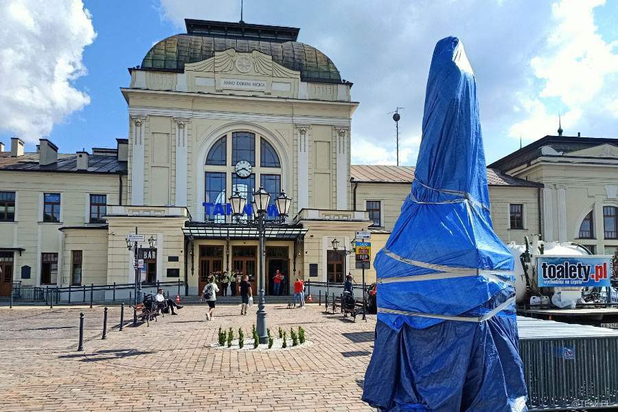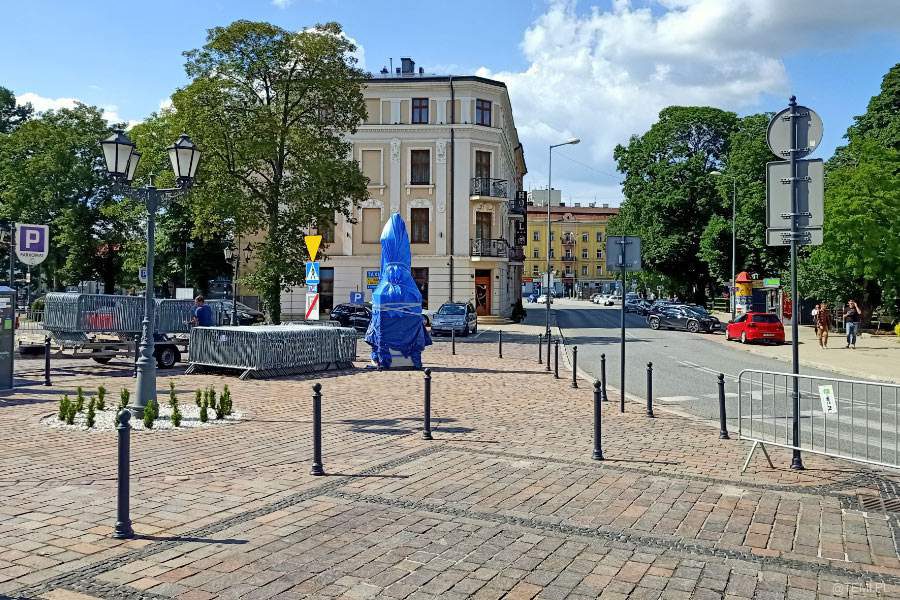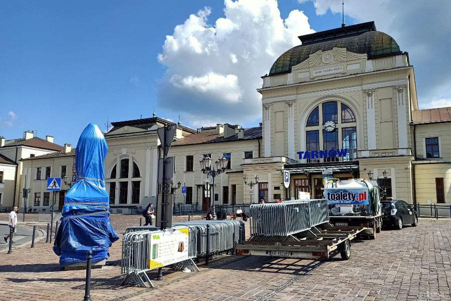 Pasażerowie korzystający z usług kolejowych spółek muszą przygotować się na utrudnienia. W związku z zaplanowanymi sobotnimi uroczystościami już niedostępna dla zmotoryzowanych jest wschodnia część parkingu przed gmachem dworca PKP. Na placu Dworcowym ustawiane są barierki, które zostaną wykorzystywane do zabezpieczenia wydarzenia oraz przenośne urządzenia sanitarne. – Czy cieszący się ogromną popularnością medialną obiekt do promocji swojej marki postanowiła wykorzystać firma zajmująca się wynajmem przenośnych toalet? Tuż obok zasłoniętego pomnika widnieje na jednym z samochodów dostawczych duży baner z nazwą witryny internetowej – zauważają nasi Czytelnicy.