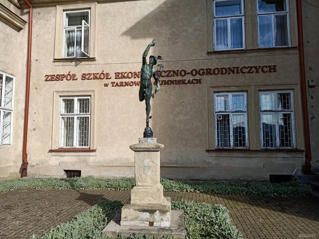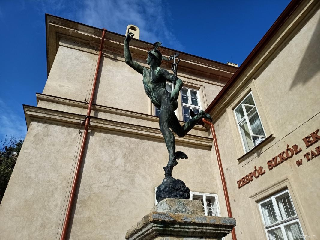 Sylwetka rzymskiego boga handlu, zysku i kupiectwa, złodziei i celników od dziesięcioleci ubogaca południowy plac – dziedziniec tarnowskiego „Ogrodnika”.