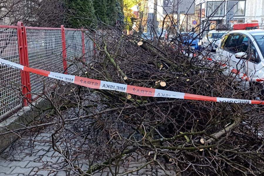 Uszkodzone drzewo nadal leży na chodniku przy ul. Nowy Świat.